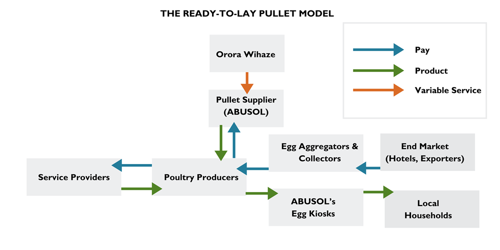 ABUSOL delivers feed and collects eggs daily, which are sold in newly established kiosks. To make eggs more affordable and accessible, Orora Wihaze helped ABUSOL invest in rural-based egg kiosks to facilitate egg sales and distribution. They trained 40 traders and retailers to ensure stronger egg aggregation, distribution, and market linkages between market actors.