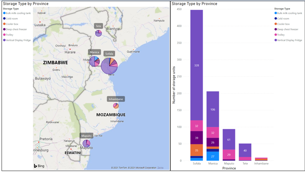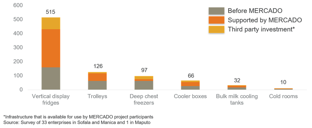 As seen through the metrics and the chart below, MERCADO, through its grants to key actors across the value chain, contributed to a substantial expansion of critical dairy storage equipment across Mozambique. Each piece of storage equipment mentioned below plays a critical role in the dairy distribution cold chain ensuring product reaching customers: